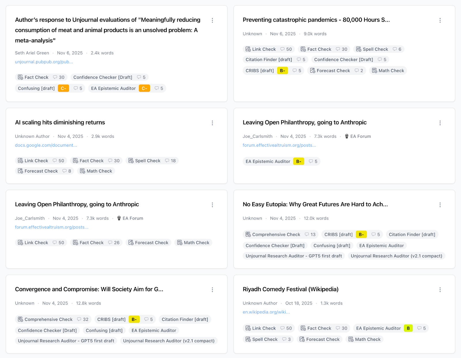 - Public trust signaling: George wants readers to (correctly) see his writing as reputable. He runs his drafts through RoastMyPost, which verifies the key claims. He then links to the evaluation in his blog post, similar to Markdown Badges on GitHub or GitLab. (Later, this could become an actual badge.)