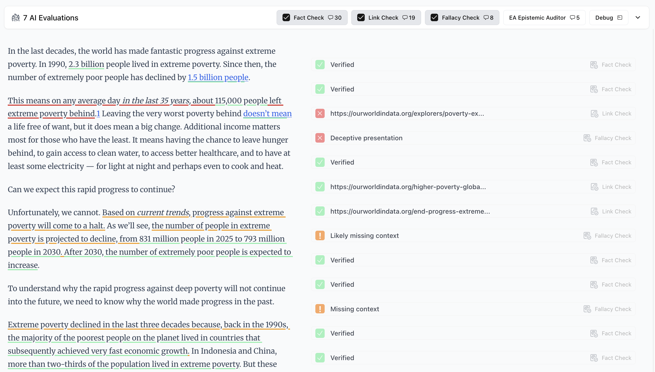 The reader page is the main article view. You can toggle different evaluators, each has a different set of inline comments.