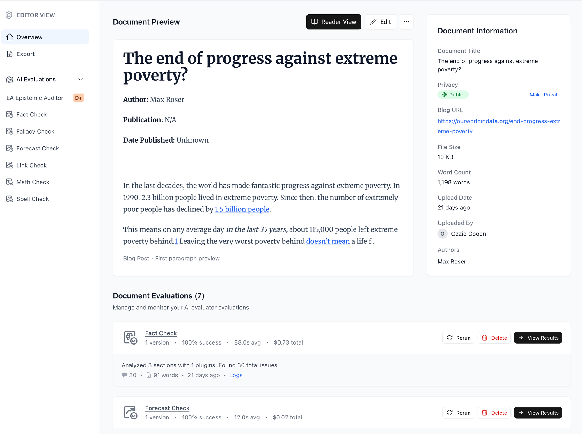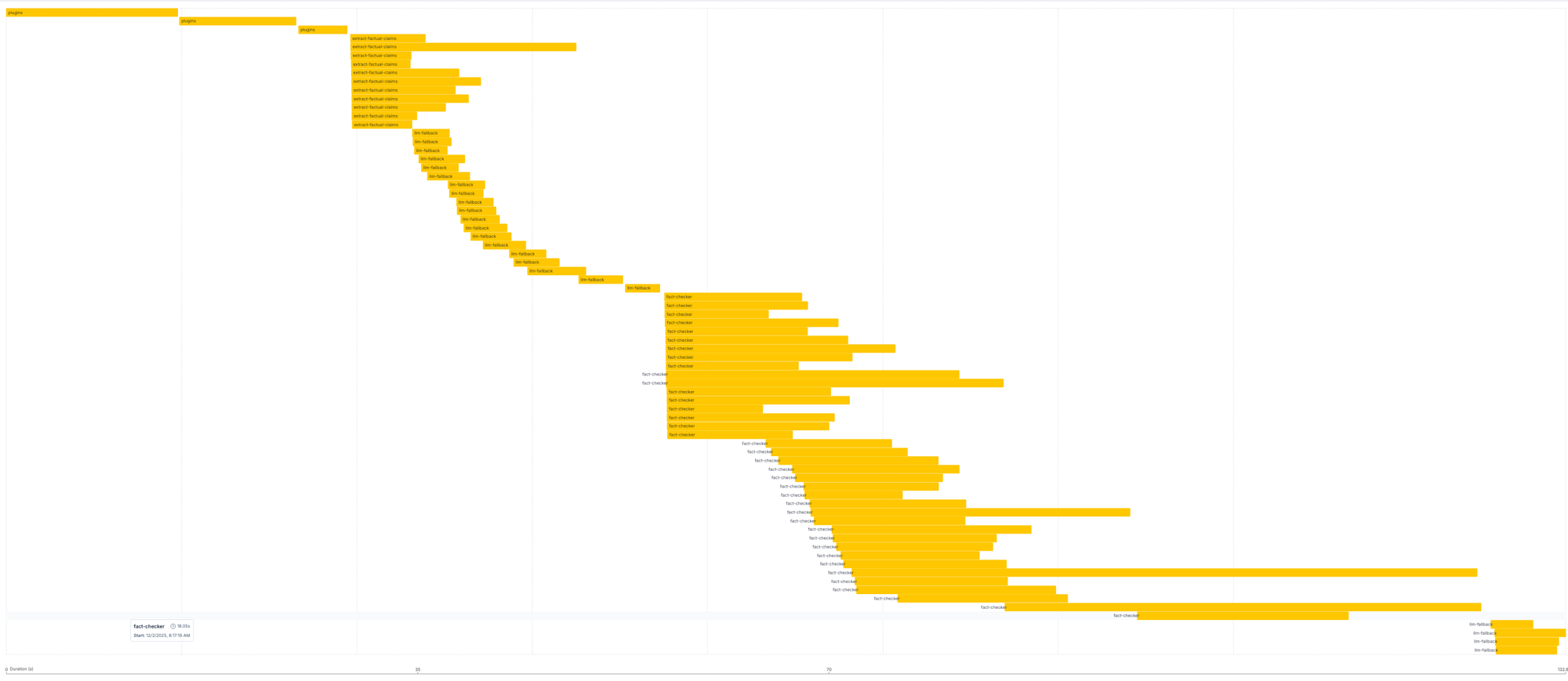 Here you can see fact checking and forecast checking running on one large document. Evaluators run checks in parallel where possible, significantly reducing processing time.