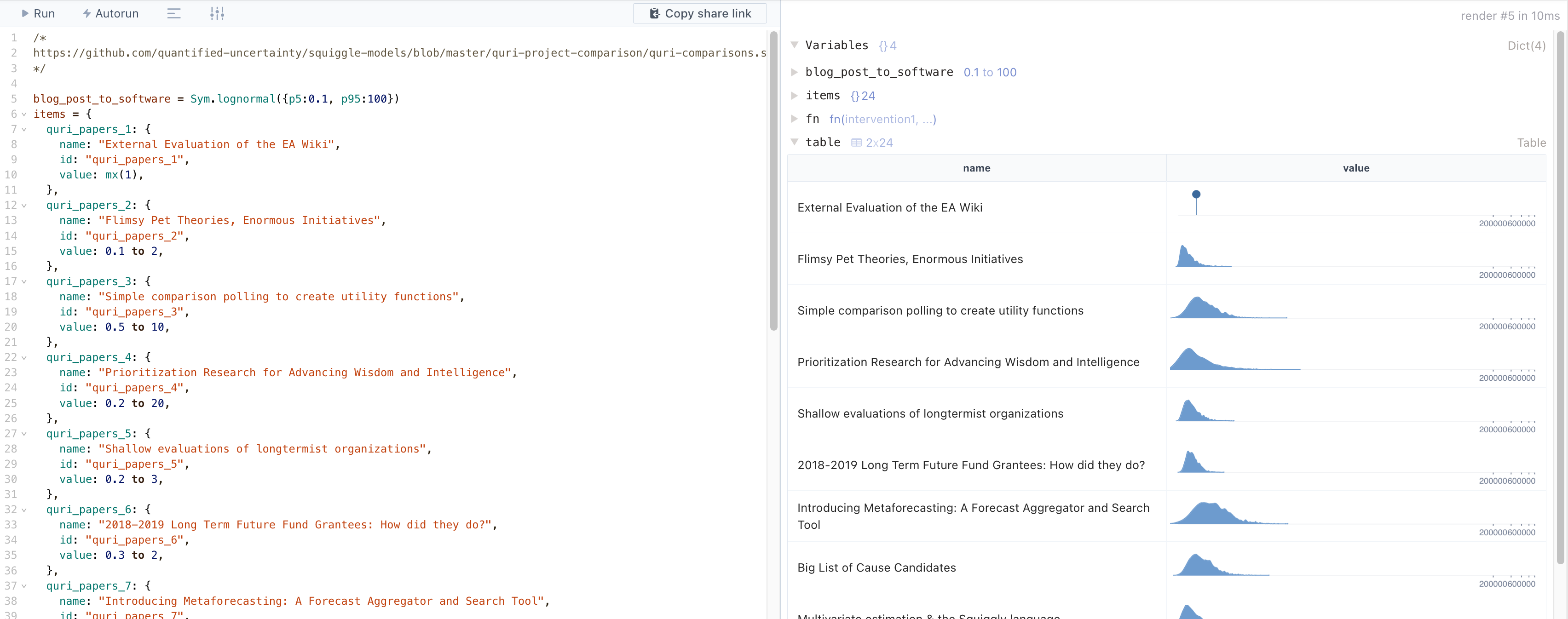 - We've started work on relative values functionality in Squiggle Hub. This is still fairly error-prone, we'll work on cleaning it up in the next few months.