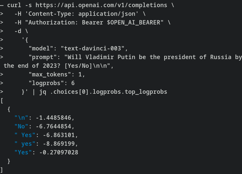 Then we can compare the relative probabilities of completion to the “Yes,” “yes,” “No” and “no” tokens. This requires a bit of care. Note that we are not making the same query 100 times and looking at the frequencies, but rather asking for the probabilities directly: