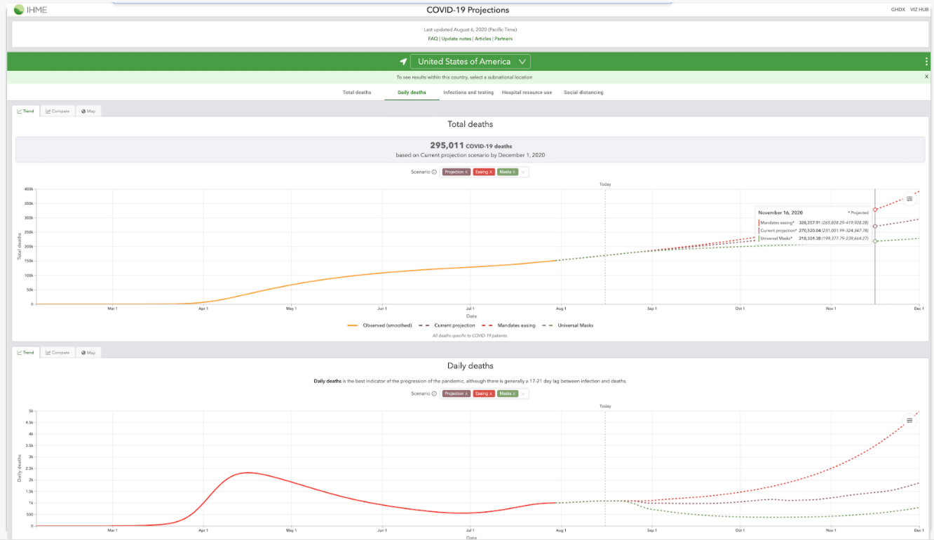 For an example, let's look at some of the existing COVID models. This is one of them, from the IHME: You can see that it made projections for total deaths, daily deaths, and a bunch of other variables. And for each indicator, you could choose a country or a location, and it gives you a forecast of what that indicator may look like. So basically there's some function that for any parameter, which could be deaths or daily deaths or time or whatever, outputs a probability density. That's the core thing that's happening. So if you were able to parameterize the model in that way, and format it in these terms, you could basically wrap the function in some encoding. And then do the same forecast, but now using a centralized encoding. So right now, basically for people to make something like the COVID dashboard from before, they have to use this intense output and write some custom GUI. It's a whole custom process. Moreover, it's very difficult to writeyour own function that calls their underlying model.