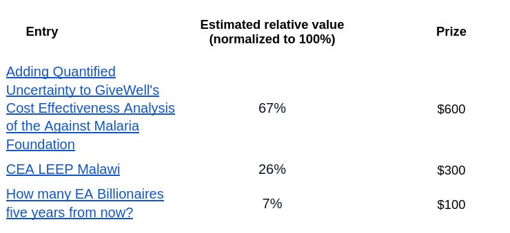 Judges for this challenge were Alex Lawsen, Sam Nolan, and Nuño Sempere. They each gave their relative estimates, which can be seen here, and these were averaged to determine what proportion of the prize each participant should receive. We’ve recently contacted the winners, and they should be receiving their prices in the near future.