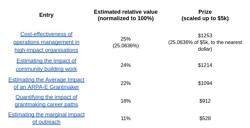For the first prize, we asked judges to estimate relative values. Then we converted these to our predetermined prize amounts. I thought that this was inelegant, so for the second prize, we instead scaled the prizes in proportion to the estimated value of the entries.